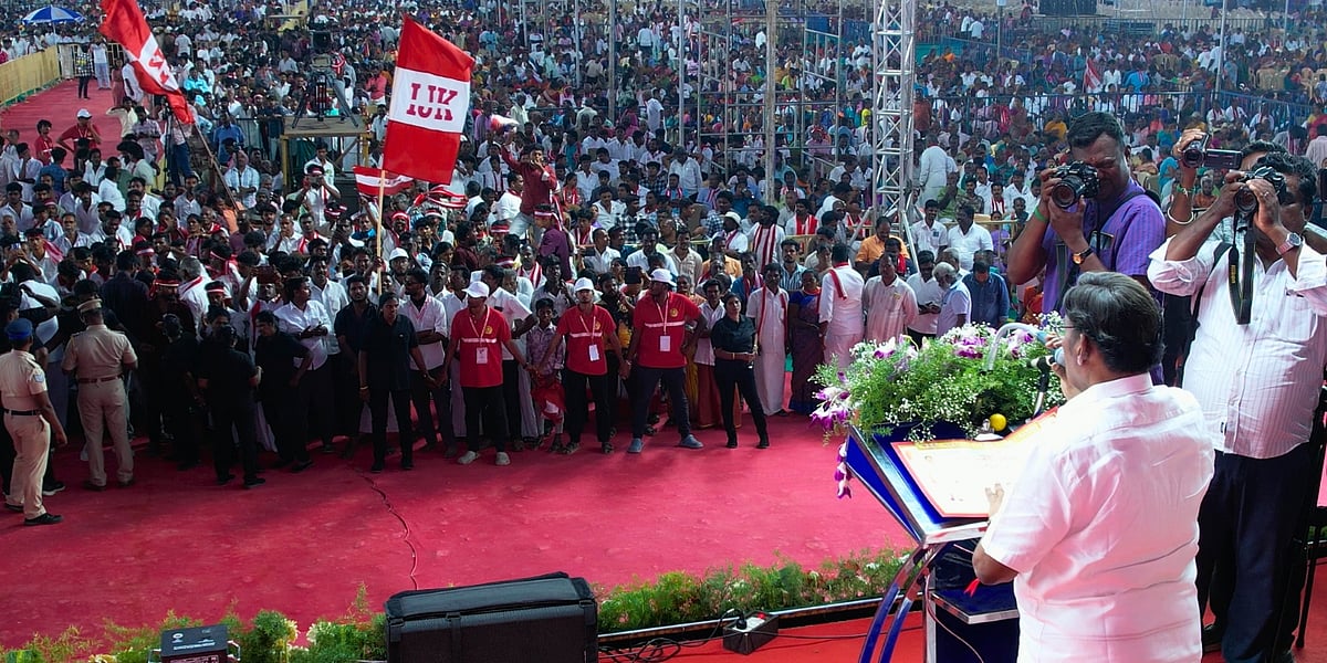 என்ற வரிகளுக்கு ஐ.ஜே.கே தொண்டர்கள் குழுக்களாக நடனமாடி ஆர்ப்பரித்தனர்.