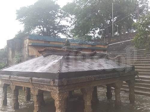பாபநாசம் கோயில் படித்துறையில் உள்ள மண்டபத்தின் மேல் தாமிரவருணியில் ஏற்பட்ட வெள்ளப்பெருக்கில் அடித்து வரப்பட்ட மரத்தடி தங்கியுள்ளது.