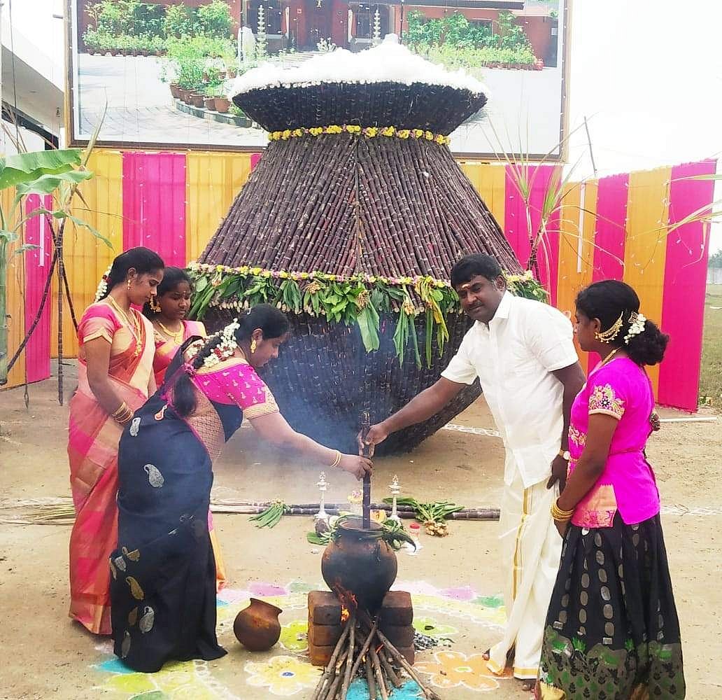 தனது வீட்டின் முன்பாக 15 அடி உயரமும், 13 அடி அகலமும் கொண்ட சுமார் ஒன்றை டன் எடை கொண்ட கரும்பு பானையை உருவாக்கினார். பின்னர் அந்தக் கரும்பு பானைக்கு முன்பாகவே தனது குடும்பத்தினர் அனைவரும் ஒன்று சேர்ந்து பொங்கல் வைத்தும் வழிபட்டனர்.